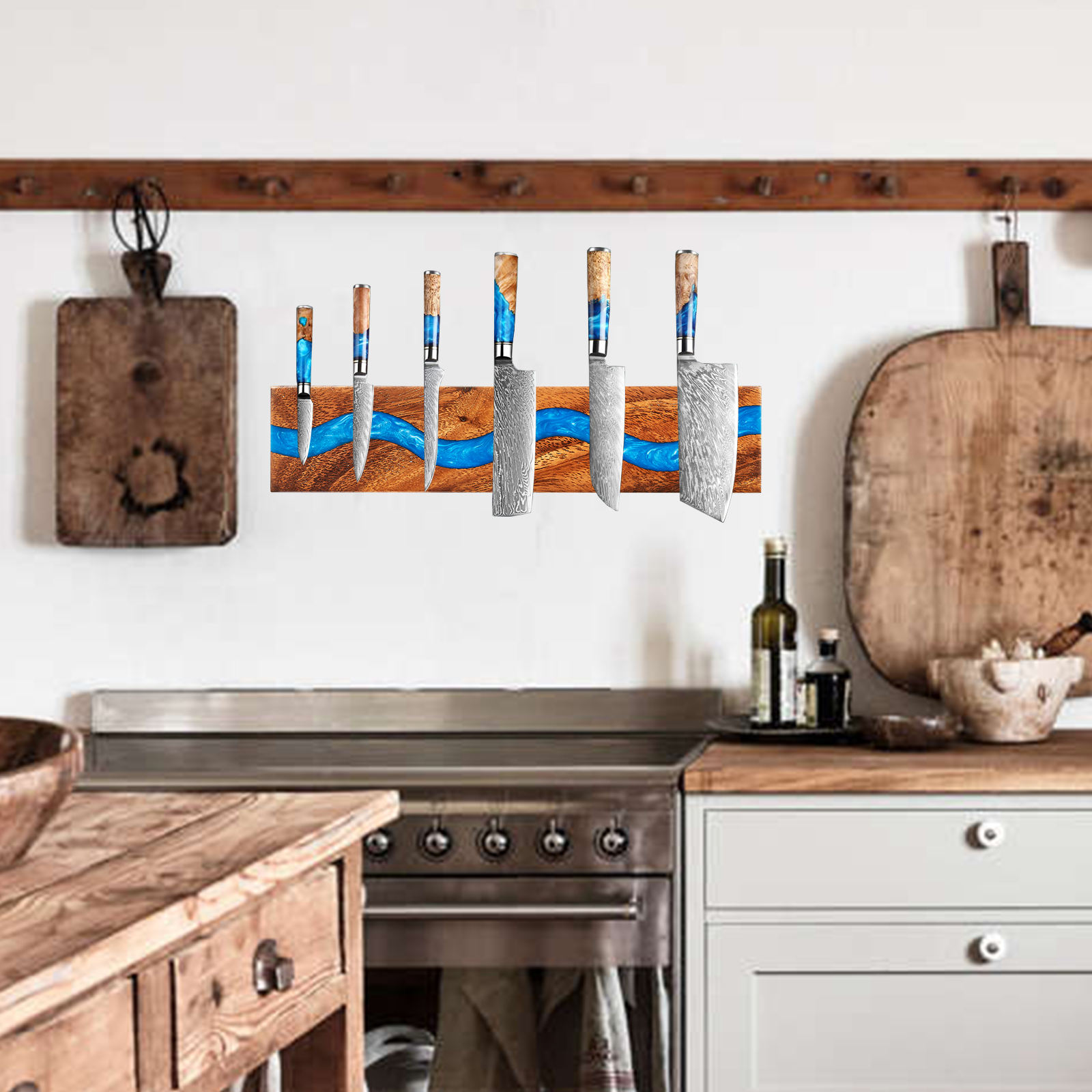 Introducing our premium Resin and Acacia Wood Magnetic Knife Holder, a stunning blend of natural acacia wood and exquisite resin craftsmanship. Each piece features a unique curved design, seamlessly combining functionality with aesthetic appeal. Note that due to the individuality of resin patterns, your strip may vary slightly from the displayed image, adding a touch of exclusivity.